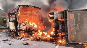 12 ಮಂದಿ ಸಜೀವ ದಹನ *ಟಿಪ್ಪರ್ಗೆ ಖಾಸಗಿ ಬಸ್ ಡಿಕ್ಕಿ: ಹೊತ್ತಿ ಉರಿದ ಬಸ್