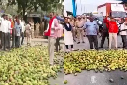 ಹೆದ್ದಾರಿಗೆ ಮಾವು ಸುರಿದು ರೈತರ ಪ್ರತಿಭಟನೆ